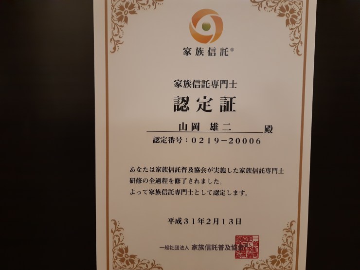 家族信託専門士に認定されました 2019年3月10日2019年4月13日山岡雄二コメントをどうぞ (家族信託専門士に認定されました) 「家族信託」は一般社団法人 家族信託普及協会の登録商標です。 共有: クリックして X で共有 (新しいウィンドウで開きます) X Facebook で共有するにはクリックしてください (新しいウィンドウで開きます) Facebook いいね 読み込み中… 関連